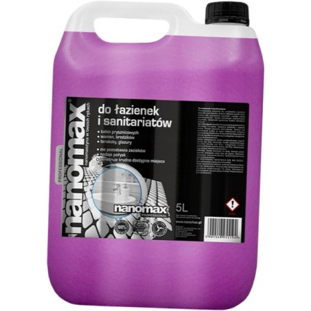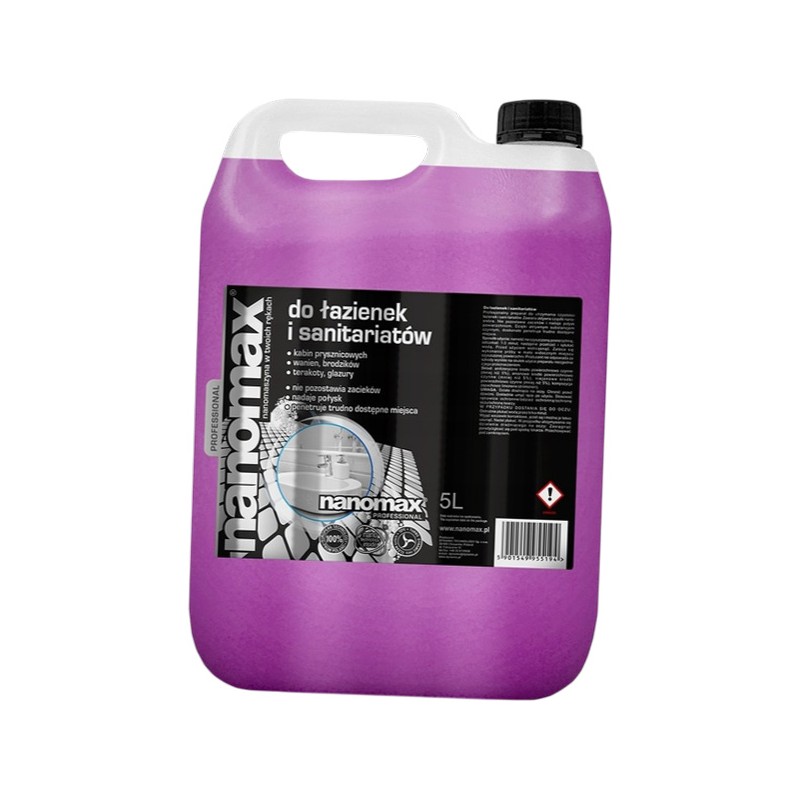 Płyn do mycia łazienek i sanitariatów NANOMAX Professional 5L - to skuteczny i wygodny w użyciu środek czyszczący stworzony z myślą o higienie w łazienkach. Idealnie radzi sobie z osadami z mydła, kamienia, zaciekami i bakteriami. Dzięki zawartości nano-srebra działa nie tylko czyszcząco, ale też antybakteryjnie – zapewniając higienę i świeżość każdej powierzchni sanitarnej.