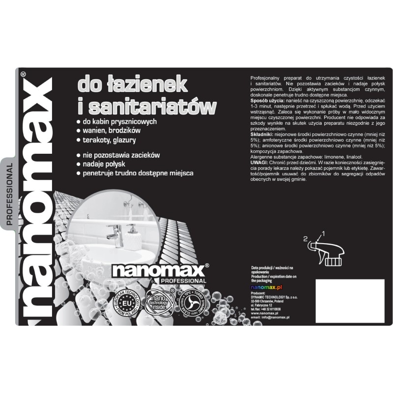 Płyn do mycia łazienek i sanitariatów NANOMAX Professional 1L - to skuteczny i wygodny w użyciu środek czyszczący stworzony z myślą o higienie w łazienkach. Idealnie radzi sobie z osadami z mydła, kamienia, zaciekami i bakteriami. Dzięki zawartości nano-srebra działa nie tylko czyszcząco, ale też antybakteryjnie – zapewniając higienę i świeżość każdej powierzchni sanitarnej.