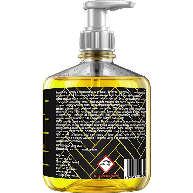 UNIWERSALNY Płyn do mycia do podłóg NANOMAX Professional 0,5L z dozownikiem - to profesjonalny koncentrat do codziennej pielęgnacji wszelkiego rodzaju zmywalnych podłóg — od paneli i drewna po płytki i laminat. Innowacyjna formuła z aktywnymi cząstkami srebra skutecznie czyści, nabłyszcza i tworzy powłokę ochronną, która spowalnia osadzanie się kurzu i zabrudzeń.