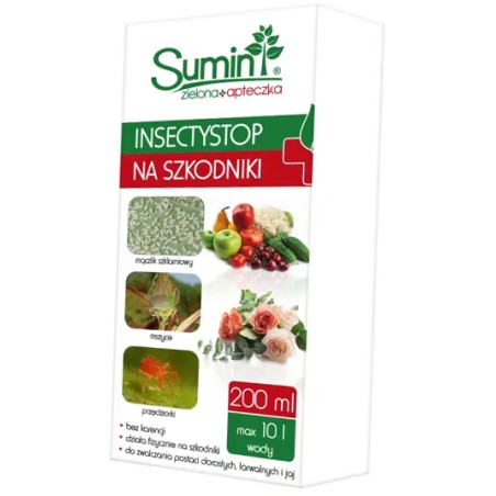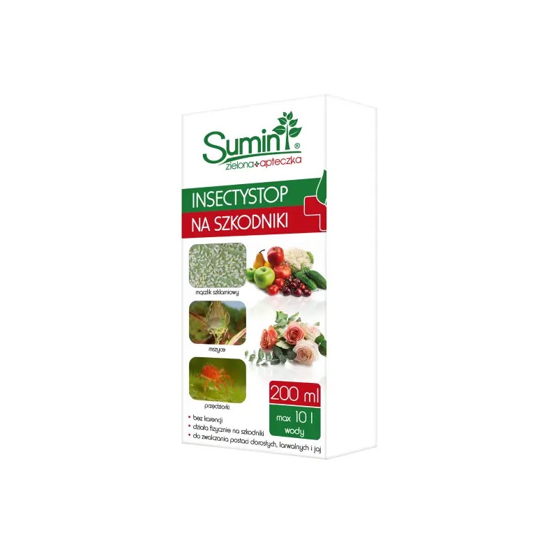 SUMIN Insectystop to naturalny insektycyd oparty na soli potasowej kwasów tłuszczowych (515 g/l; 49,66%), przeznaczony do zwalczania szerokiego spektrum szkodników, takich jak mszyce, przędziorki i mączliki szklarniowe. Działa fizycznie, uszkadzając struktury zewnętrzne owadów i zakłócając ich podstawowe funkcje życiowe, co prowadzi do ich eliminacji. Produkt jest bezpieczny dla ludzi, zwierząt i środowiska, co czyni go idealnym rozwiązaniem dla upraw ekologicznych oraz użytkowników poszukujących alternatywy dla chemicznych środków ochrony roślin.
