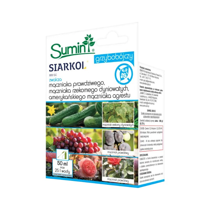 SUMIN SIARKOL 800 SC to skuteczny fungicyd w formie koncentratu zawiesinowego (SC), zawierający 800 g/l siarki (55,73%). Działa powierzchniowo i kontaktowo, tworząc na roślinie warstwę ochronną, która zapobiega rozwojowi patogenów grzybowych, takich jak mączniak prawdziwy. Może być stosowany zarówno zapobiegawczo, jak i interwencyjnie.