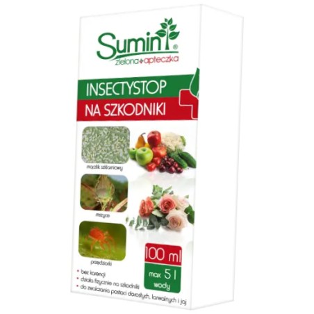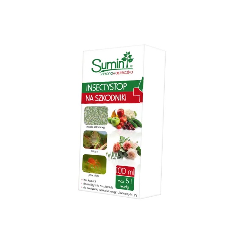 SUMIN Insectystop to naturalny insektycyd oparty na soli potasowej kwasów tłuszczowych (515 g/l; 49,66%), przeznaczony do zwalczania szerokiego spektrum szkodników, takich jak mszyce, przędziorki i mączliki szklarniowe. Działa fizycznie, uszkadzając struktury zewnętrzne owadów i zakłócając ich podstawowe funkcje życiowe, co prowadzi do ich eliminacji. Produkt jest bezpieczny dla ludzi, zwierząt i środowiska, co czyni go idealnym rozwiązaniem dla upraw ekologicznych oraz użytkowników poszukujących alternatywy dla chemicznych środków ochrony roślin.