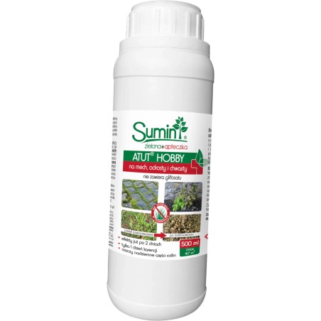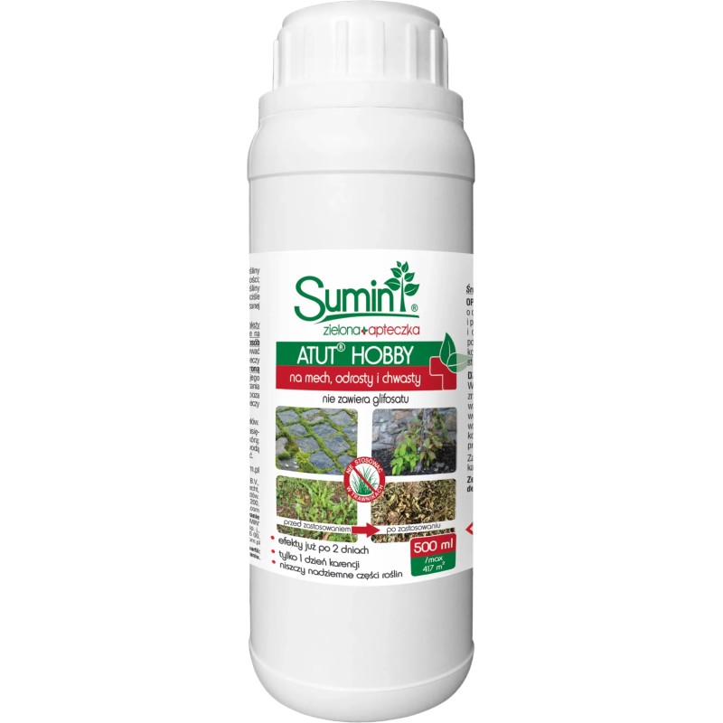 Środek na chwasty i mech SUMIN Atut HOBBY to płynny preparat kontaktowy, przeznaczony do amatorskiego użycia w ogrodach działkowych, przydomowych uprawach drzew i krzewów owocowych oraz winorośli. Skutecznie niszczy zielone części chwastów, odrostów i mchu bez przenikania do gleby.