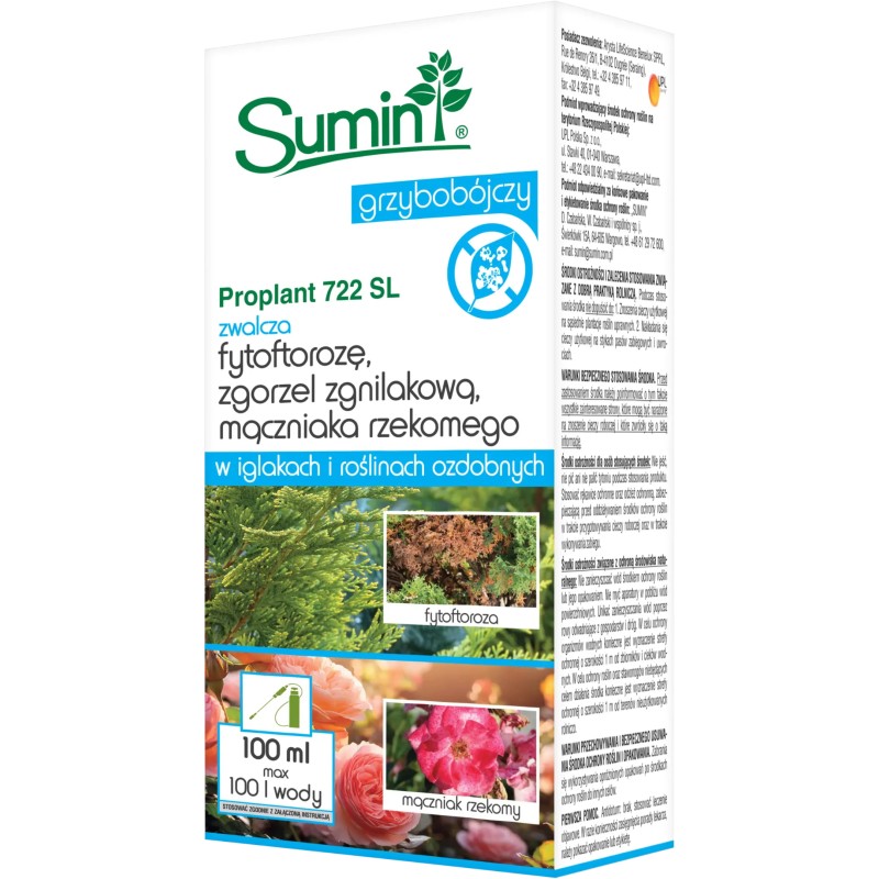 Środek na choroby grzybowe iglaków i roślin ozdobnych SUMIN Proplant 722SL to układowy fungicyd w formie koncentratu wodnego, przeznaczony do zapobiegawczego oraz interwencyjnego zwalczania chorób grzybowych, takich jak fytoftoroza, mączniak rzekomy czy zgorzel, w iglakach, roślinach ozdobnych oraz warzywach.