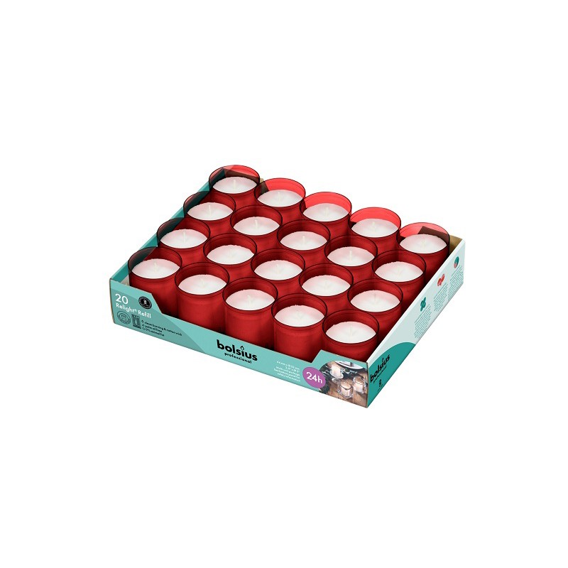 Świeca dekoracyjna ze świecznikiem, w kolorze czerwonym, bezzapachowa, o wysokości 6,4cm, średnicy 5,2cm i czasie palenia do 24 godzin BOLSIUS. Świece pakowane po 20 szt. jednostkowych w opakowaniu zbiorczym.