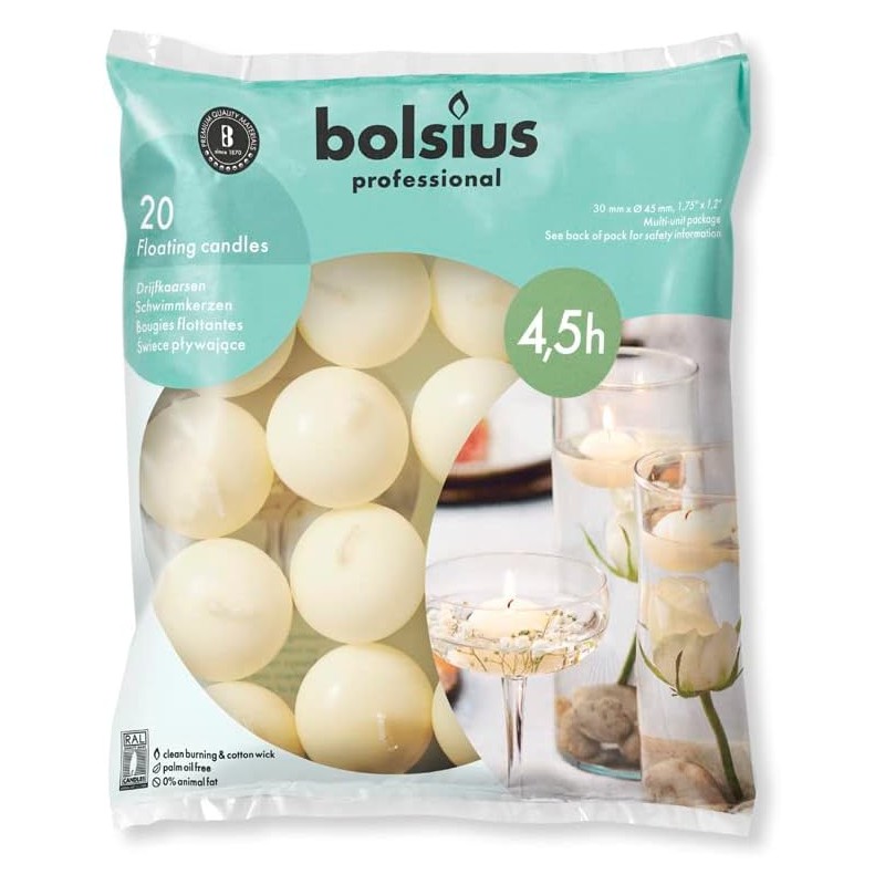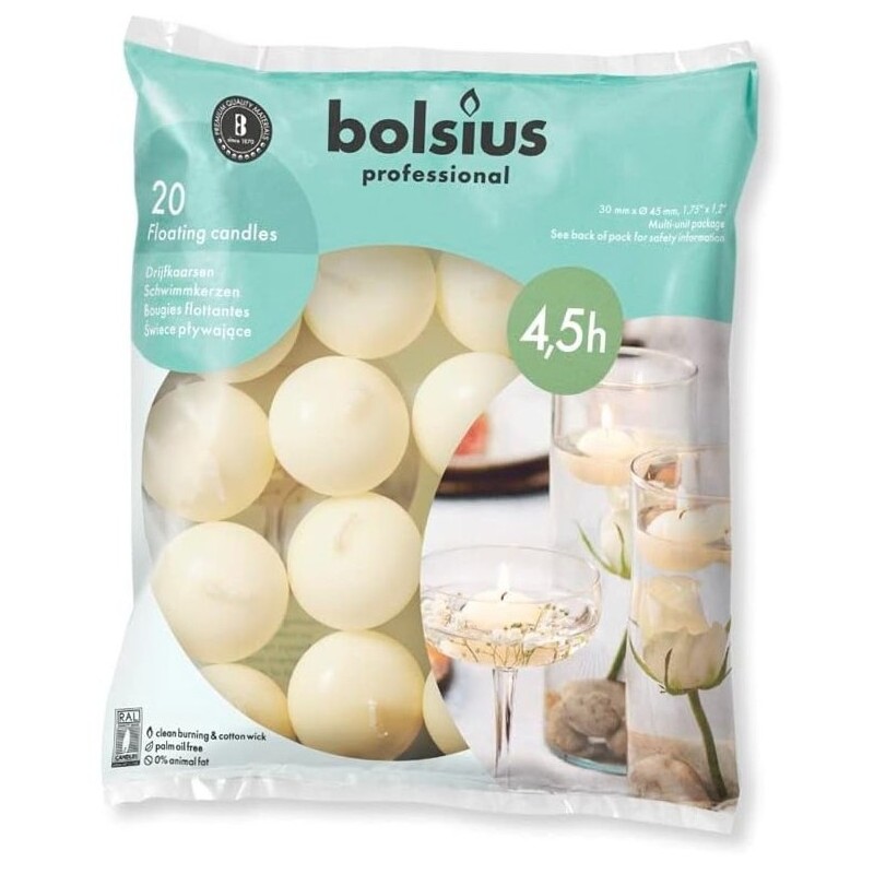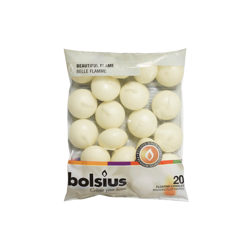 Świeca pływająca w kolorze kremowym, bezzapachowa, o wysokości 3cm, średnicy 4cm i czasie palenia do 4,5 godziny BOLSIUS.