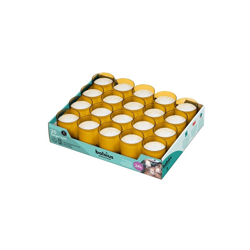 Świeca dekoracyjna ze świecznikiem, w kolorze bursztynowym, bezzapachowa, o wysokości 6,4cm, średnicy 5,2cm i czasie palenia do 24 godzin BOLSIUS. Świece pakowane po 20 szt. jednostkowych w opakowaniu zbiorczym.