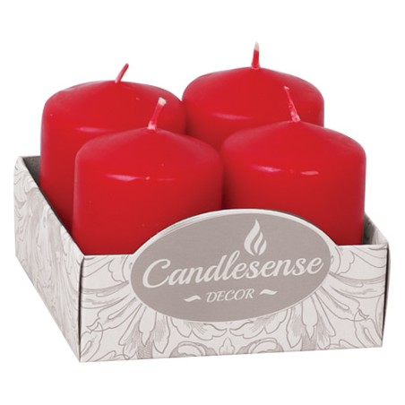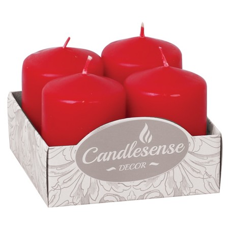Czerwona świeca wotywna w kształcie walcabezzapachowa o wysokości 6cmśrednicy 4cm i czasie palenia do 8 godzin CANDLESENSE. Pakowana po 4 szt. jednostkowe w opakowaniu zbiorczym.