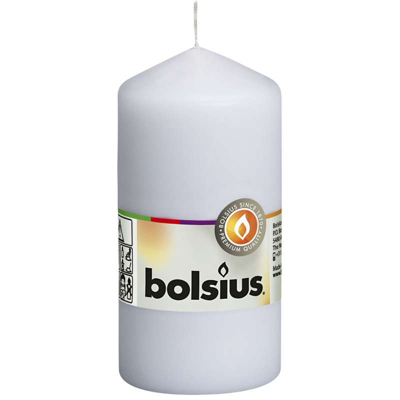 Dekoracyjna świeca pieńkowa w kształcie walca, kolorze białymbezzapachowa o wysokości 12cm, średnicy 5,8cm i czasie palenia do 33 godzin BOLSIUS.