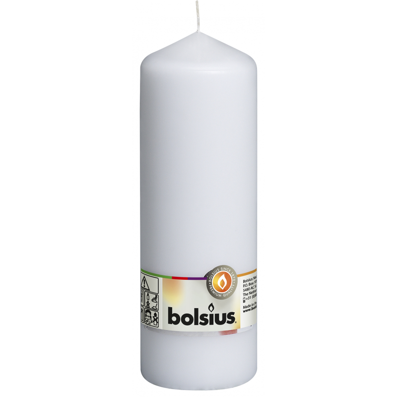 Świeca dekoracyjna w kształcie walca, kolorze białymbezzapachowa o wysokości 20cm, średnicy 6,8cm i czasie palenia do 75 godzin BOLSIUS.