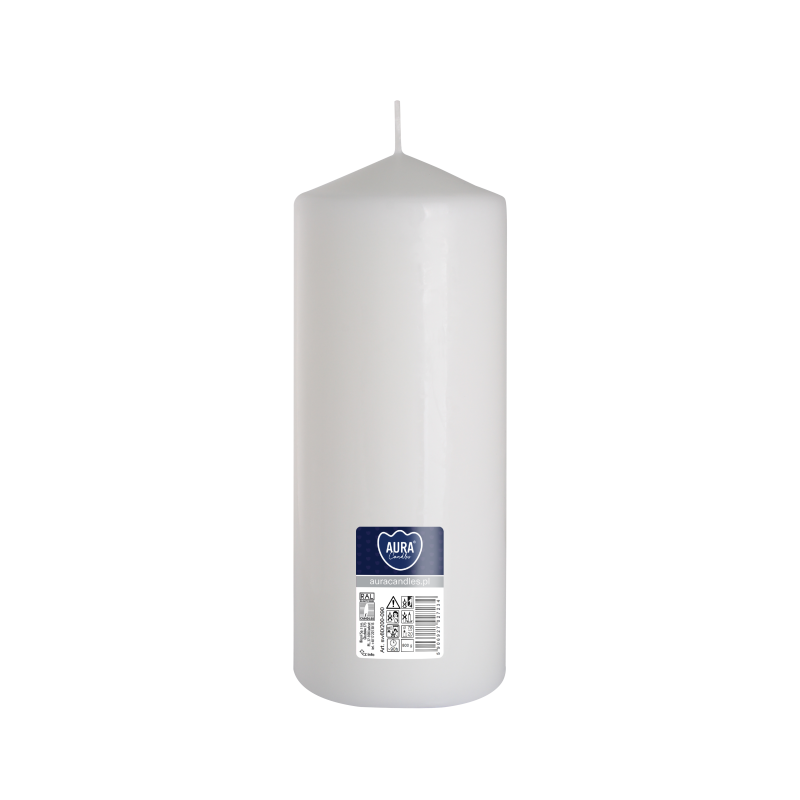 Biała świeca dekoracyjna w kształcie walca, bezzapachowa o wysokości 20cm, średnicy 7,8cm i czasie palenia do 90 godzin BISPOL.