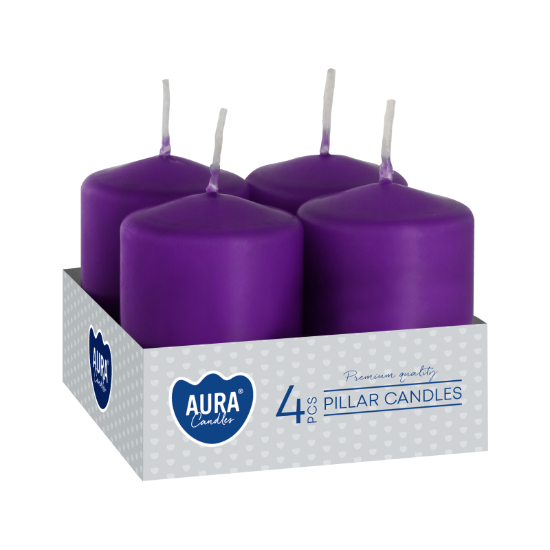Fioletowa świeca wotywna w kształcie walcabezzapachowa o wysokości 6cmśrednicy 3,8cm i czasie palenia do 7 godzin BISPOL. Pakowana po 4 szt. jednostkowe w opakowaniu zbiorczym.