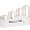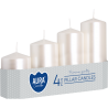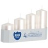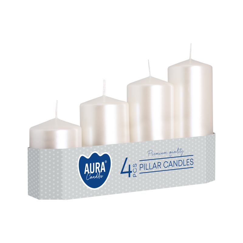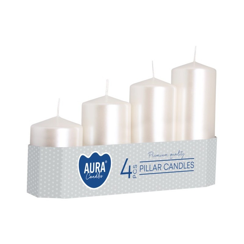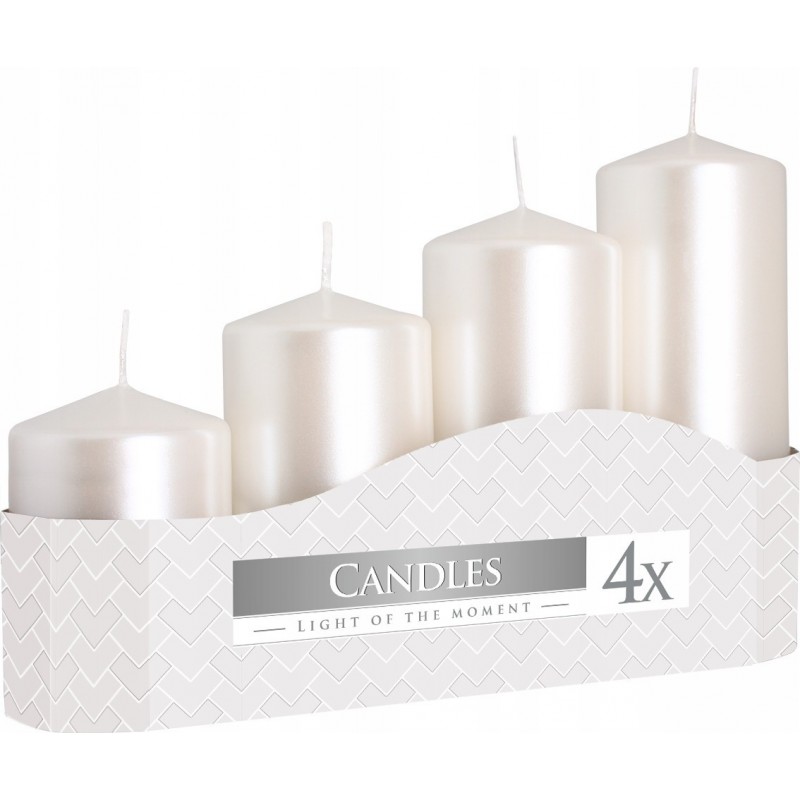 Zestaw świec stopniowanych w kształcie walca, w kolorze biała perła, bezzapachowe, o wysokościach 7cm, 9cm,11cm,13cm, średnicy 4,8cm i czasie palenia od 11 do 33 godzin BISPOL. Pakowane po 4 szt. jednostkowe w opakowaniu zbiorczym.