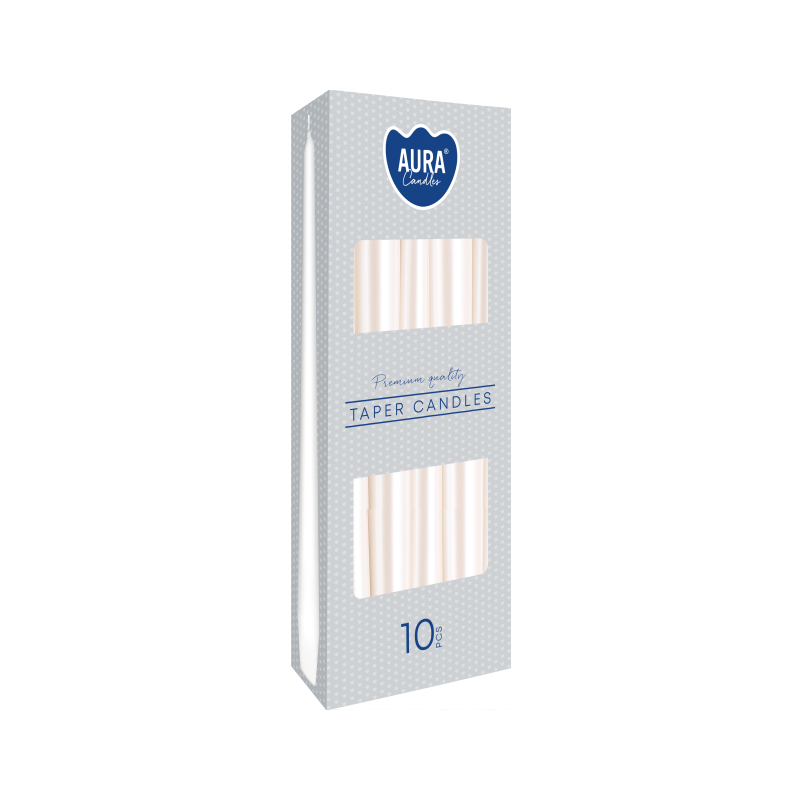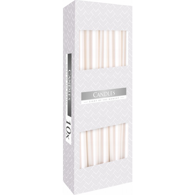 Dekoracyjna świeca stołowa w kształcie stożka, w kolorze biała perłaniekapiącabezzapachowa o wysokości 24,5cmśrednicy 2,3cm i czasie palenia do 7 godzin BISPOL. Pakowana po 10 szt. jednostkowych w opakowaniu zbiorczym.