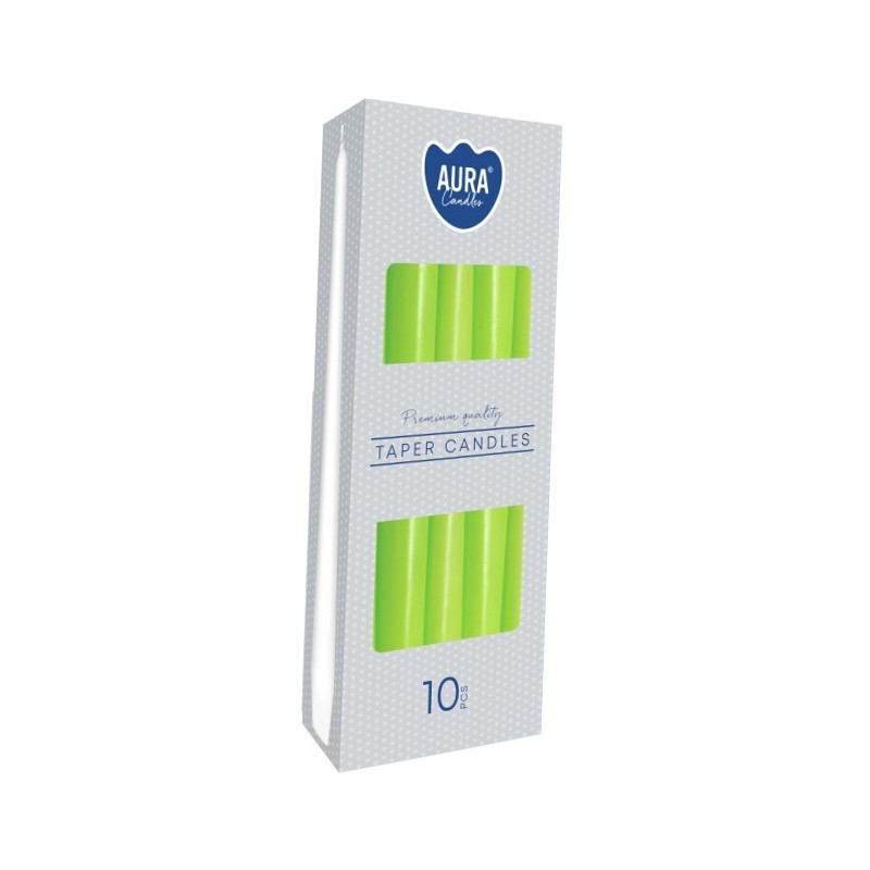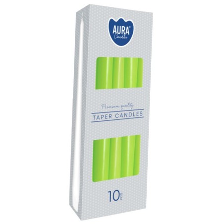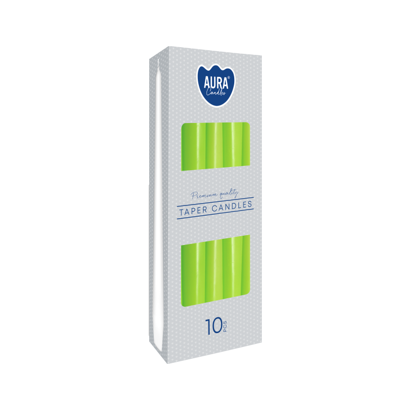 Dekoracyjna świeca stołowa w kształcie stożka, w kolorze seledynowym, niekapiąca, bezzapachowa o wysokości 24,5cm, średnicy 2,3cm i czasie palenia do 7 godzin BISPOL. Pakowana po 10 szt. jednostkowych w opakowaniu zbiorczym.