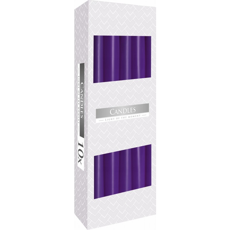Dekoracyjna świeca stołowa w kształcie stożka, w kolorze fioletowym, niekapiąca, bezzapachowa o wysokości 24,5cm, średnicy 2,3cm i czasie palenia do 7 godzin BISPOL. Pakowana po 10 szt. jednostkowych w opakowaniu zbiorczym.