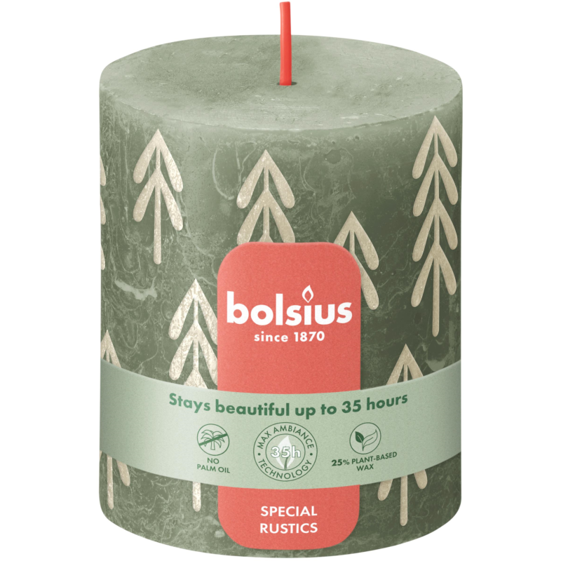 Świeca rustykalna z serii special w kolorze zielona oliwka, nadrukiem z motywem jodły, kształcie walca, bezzapachowa, o wysokości 8cm, średnicy 6,8cm i czasie palenia do 35 godzin BOLSIUS.