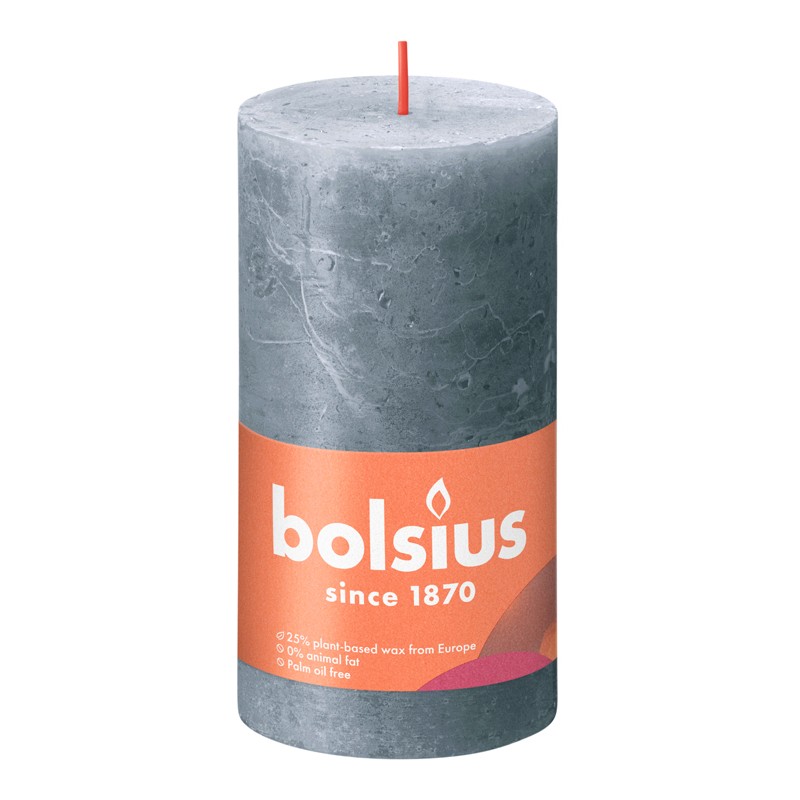 Świeca rustykalna w kolorze szlachetny niebieski, kształcie walca, bezzapachowa, o wysokości 13cm, średnicy 6,8cm i czasie palenia do 60 godzin BOLSIUS.