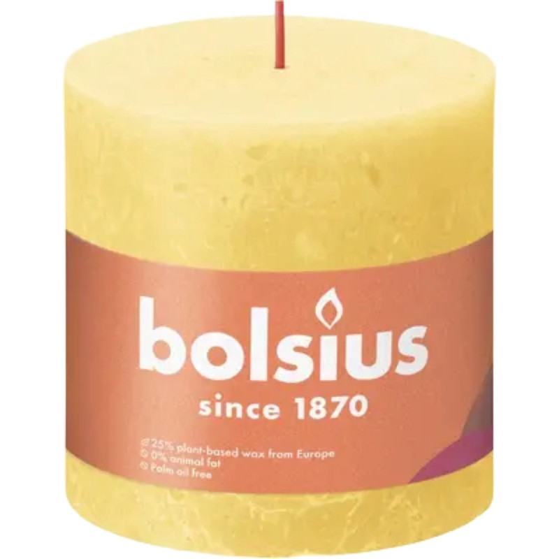 Świeca rustykalna w kolorze słonecznego żółtego, kształcie walca, bezzapachowa, o wysokości 10cm, średnicy 10cm i czasie palenia do 62 godzin BOLSIUS.