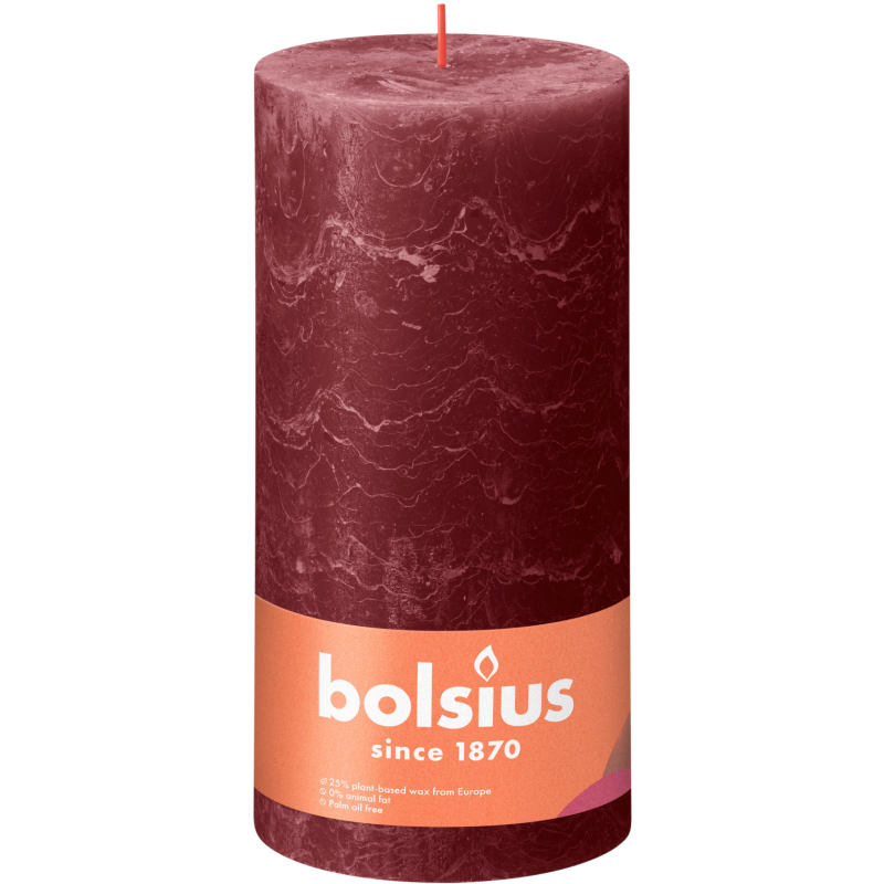 Świeca rustykalna w kolorze aksamitnej czerwieni, kształcie walca, bezzapachowa, o wysokości 20cm, średnicy 10cm i czasie palenia do 125 godzin BOLSIUS.