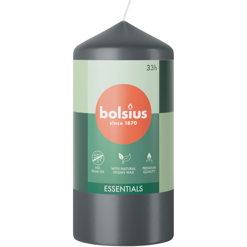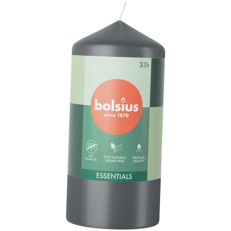 Dekoracyjna świeca pieńkowa z serii essentials w kształcie walca, kolorze burzowy szary, bezzapachowa o wysokości 12cm, średnicy 5,8cm i czasie palenia do 33 godzin BOLSIUS.
