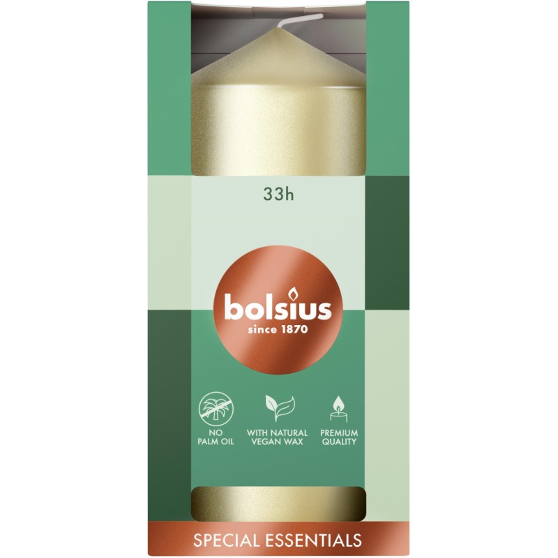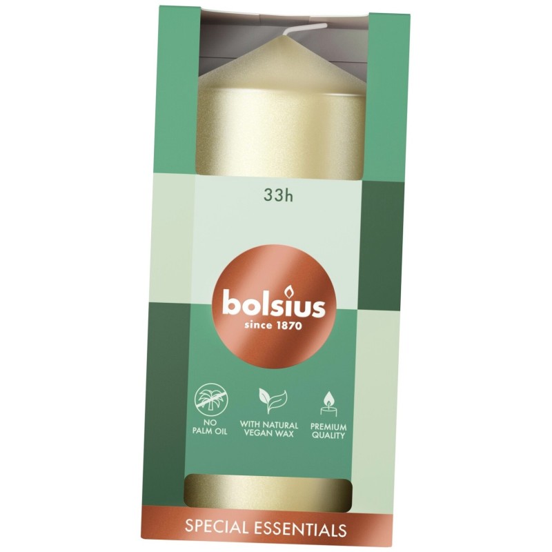 Dekoracyjna świeca pieńkowa z serii Special essentials w kształcie walca, kolorze metaliczny perłowy, bezzapachowa o wysokości 12cm, średnicy 5,8cm i czasie palenia do 33 godzin BOLSIUS.
