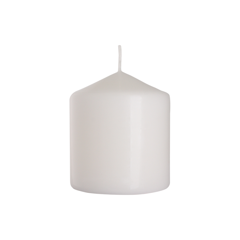Biała świeca dekoracyjna w kształcie walca, bezzapachowa o wysokości 9cm, średnicy 7,8cm i czasie palenia do 38 godzin BISPOL.