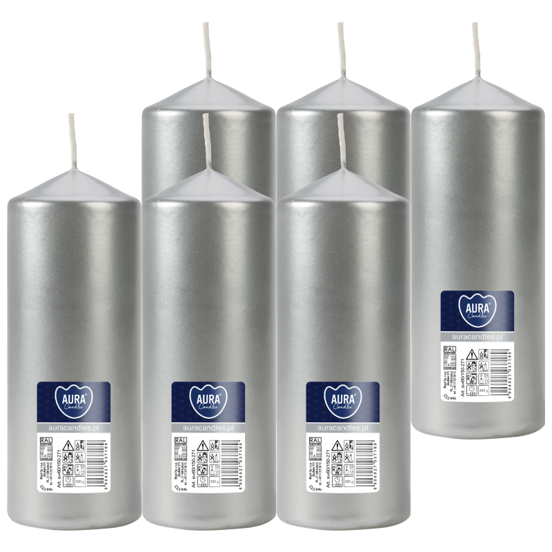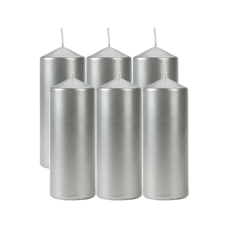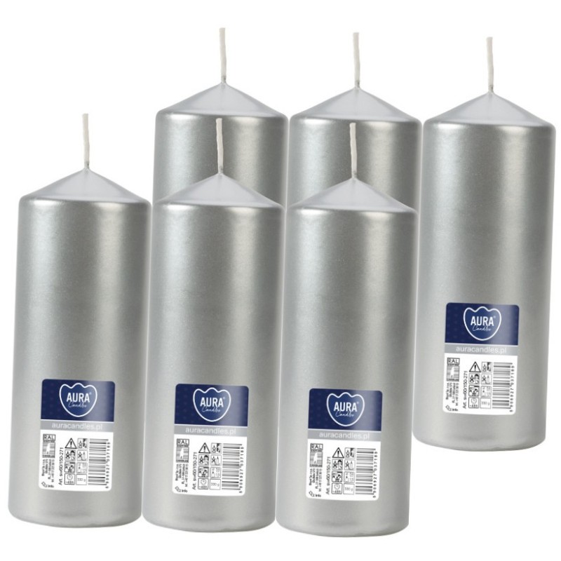 Świeca dekoracyjna w kolorze srebrny metalik, kształcie walca, bezzapachowa o wysokości 15cm, średnicy 5,8cm i czasie palenia do 48 godzin BISPOL. Pakowana po 6szt. jednostkowych w opakowaniu zbiorczym.