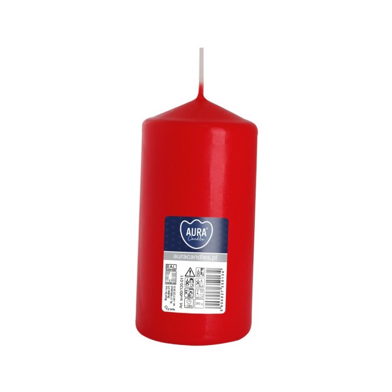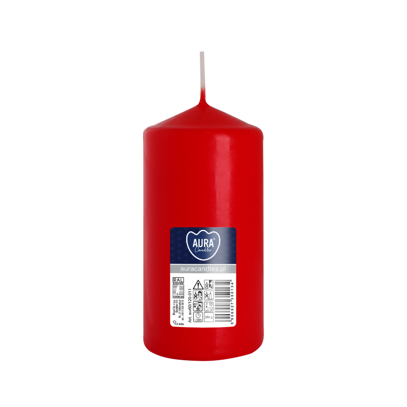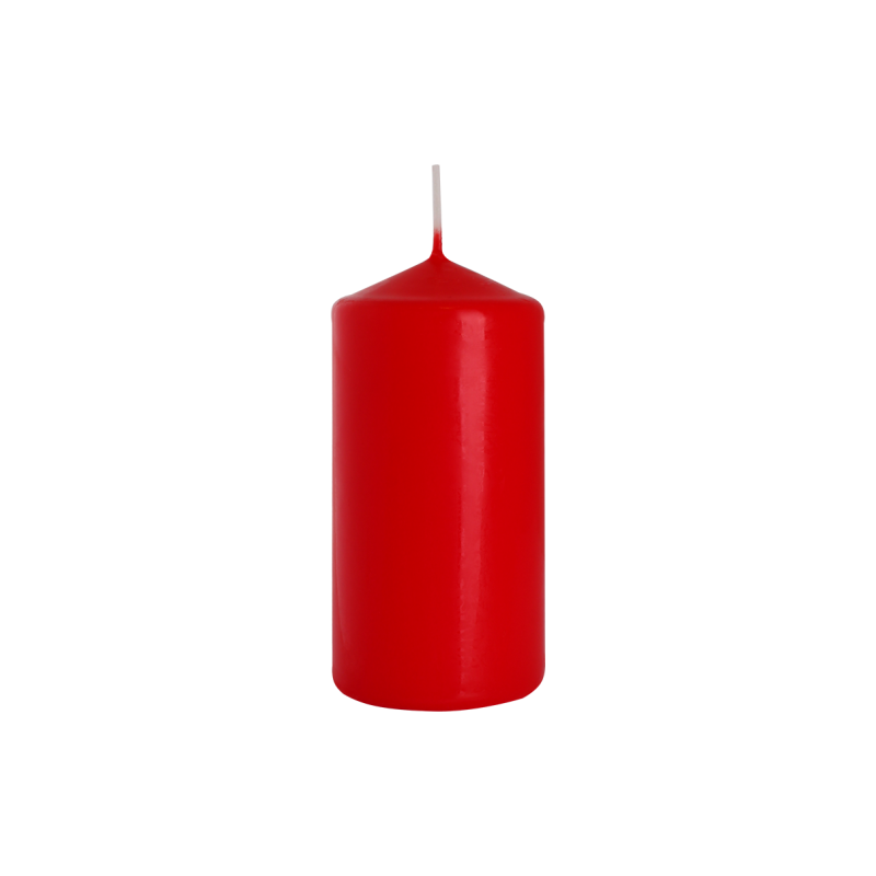 Czerwona świeca dekoracyjna w kształcie walca, bezzapachowa o wysokości 12cm, średnicy 5,8cm i czasie palenia do 38 godzin BISPOL.