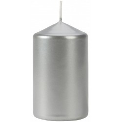 Świeca dekoracyjna w kolorze srebrny metalik, kształcie walca, bezzapachowa o wysokości 10cm, średnicy 5,8cm i czasie palenia do 30 godzin BISPOL.