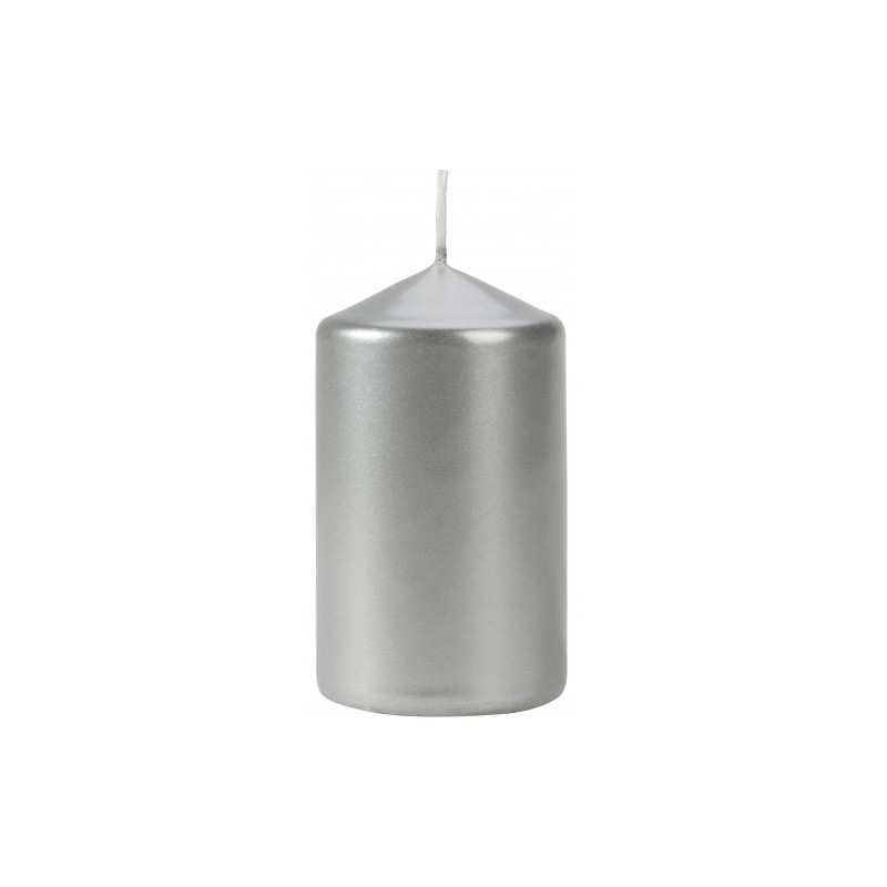 Świeca dekoracyjna w kolorze srebrny metalikkształcie walca, bezzapachowa o wysokości 10cm, średnicy 5,8cm i czasie palenia do 30 godzin BISPOL.