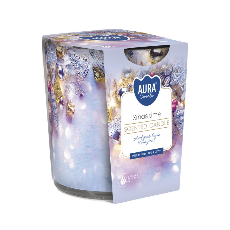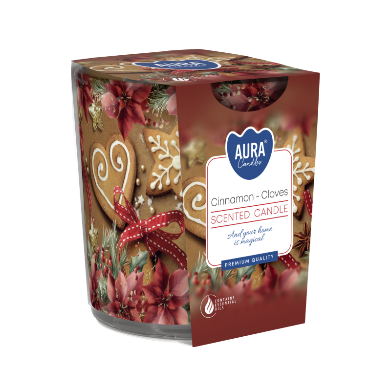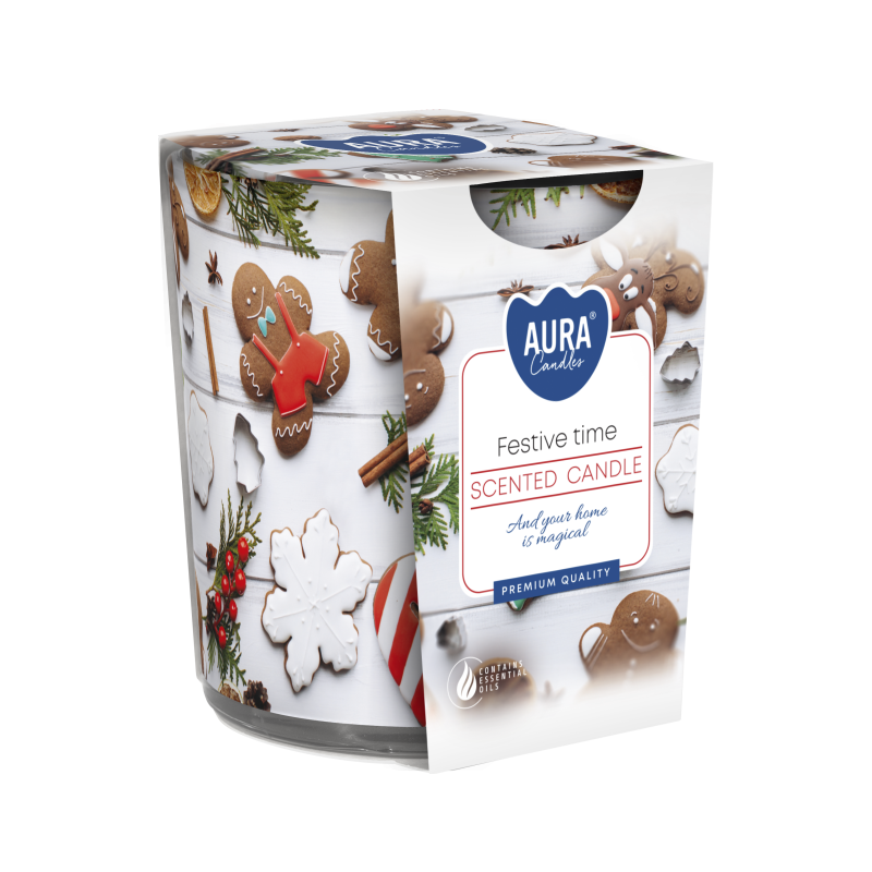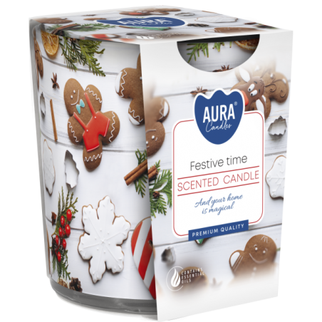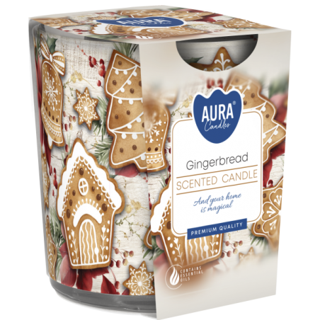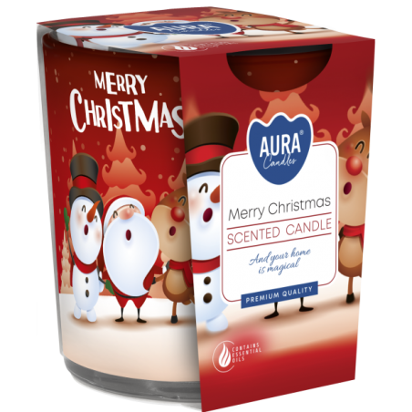 Świeca zapachowa w szkle, ozdobiona folią z motywem świątecznym oraz czasem palenia do 22 godzin BISPOL.