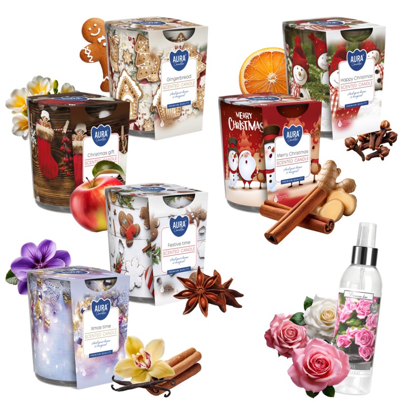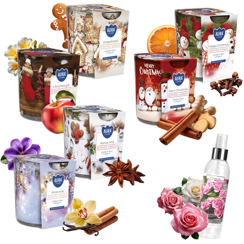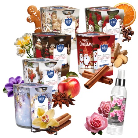 ZESTAW Świeca zapachowa w szkle BISPOL Aura 22H 6 szt. ŚWIĄTECZNY MIX + Mgiełka zapachowa BISPOL 185ml RÓŻA
