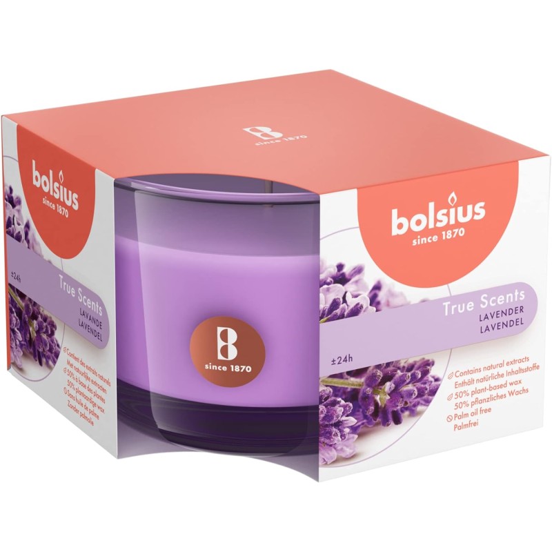 Świeca zapachowa w szkle z serii True Scents o zapachu lawendy oraz czasie palenia do 24 godzin BOLSIUS.