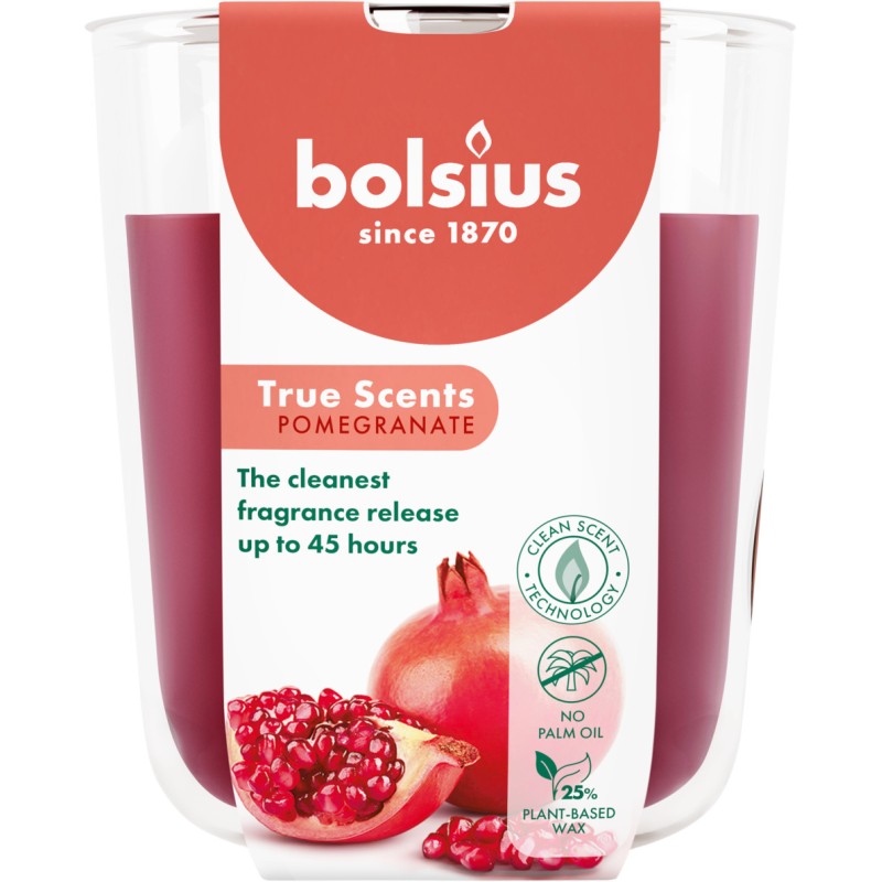 Świeca zapachowa w szkle z serii True Scents o zapachu granatu oraz czasie palenia do 45 godzin BOLSIUS.