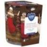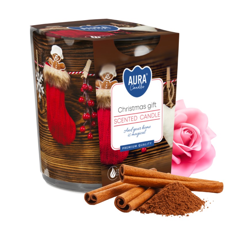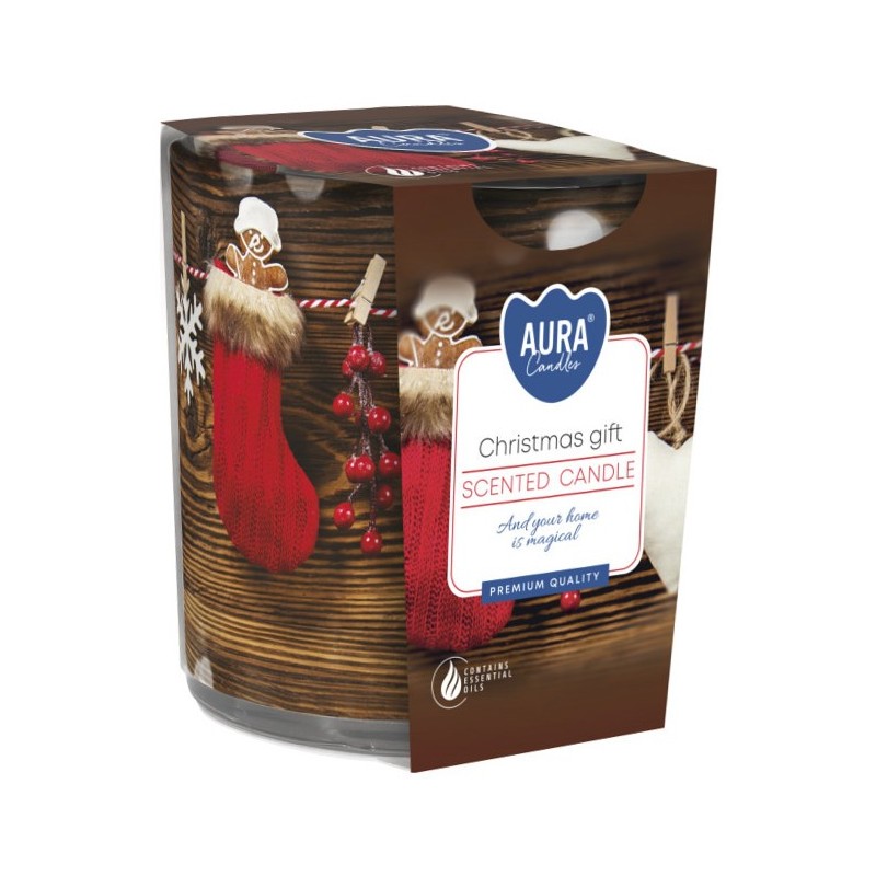 Świeca zapachowa w szkle, ozdobiona folią z motywem świątecznego prezentu oraz czasem palenia do 22 godzin BISPOL.