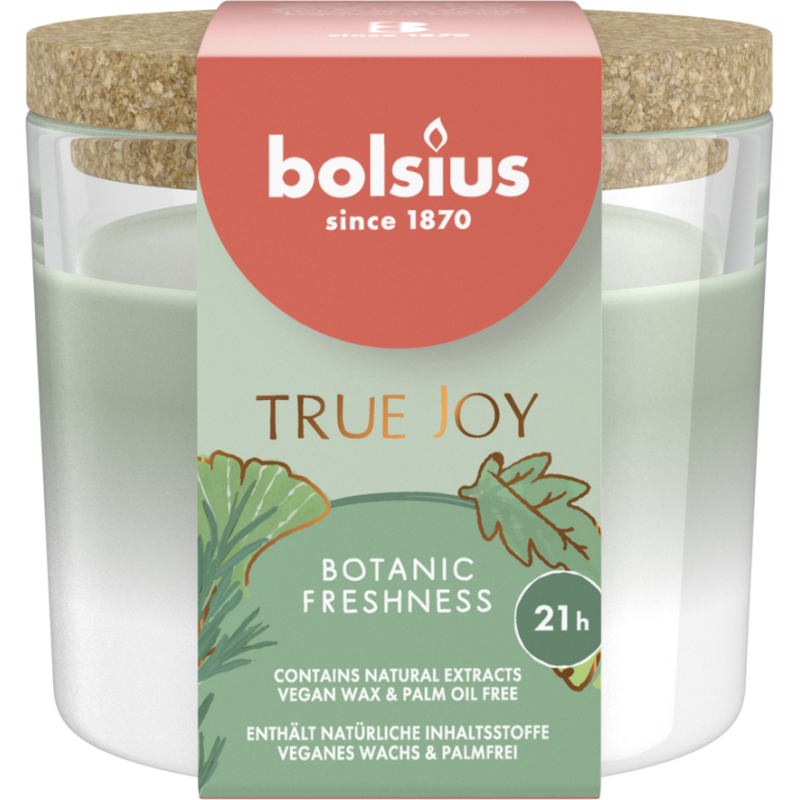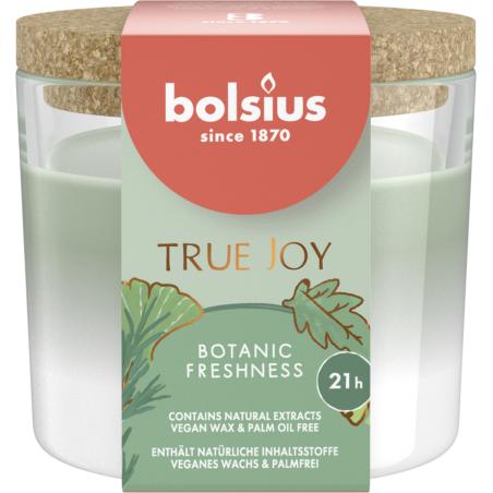 Świeca zapachowa w szkle z wieczkiem, z serii True Joy o zapachu Botanic Freshness oraz czasie palenia do 21 godzin BOLSIUS.