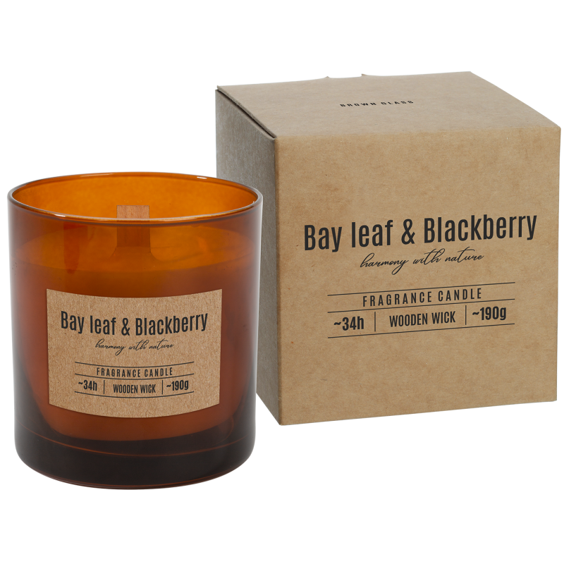 Świeca zapachowa w szkle z drewnianym knotem o zapachu liścia laurowego i jeżyny oraz czasem palenia do 34 godzin BISPOL.