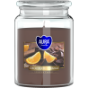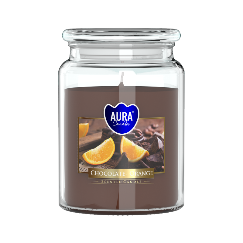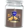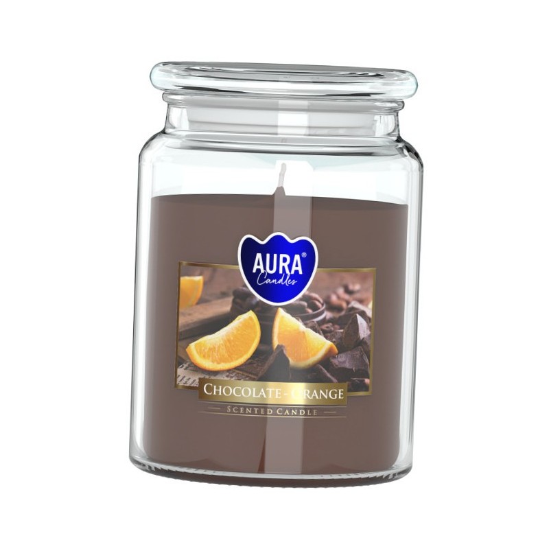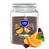 Duża świeca zapachowa w słoiku z wieczkiem, o zapachu czekolady - pomarańczy i czasie palenia do 100 godzin BISPOL.