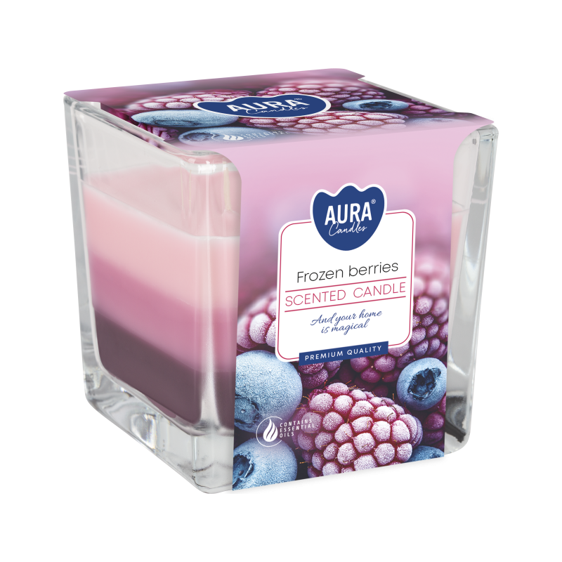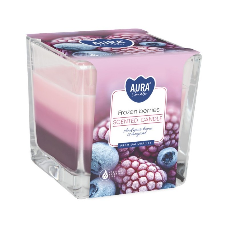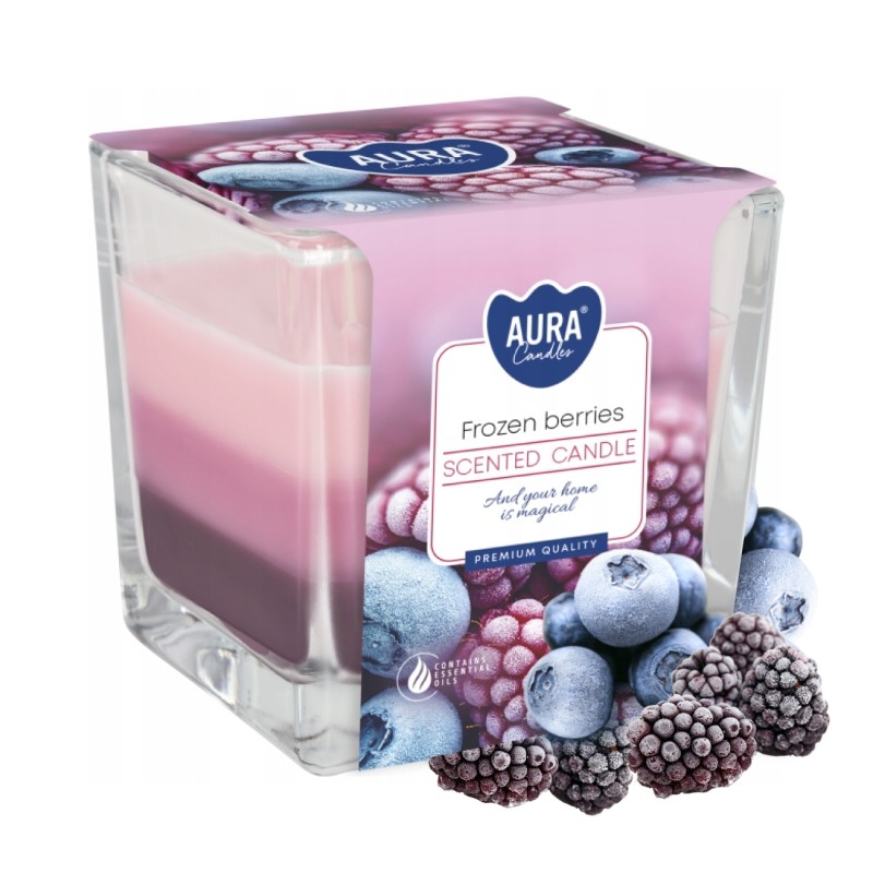 Trójwarstwowa świeca zapachowa w szkle z dwoma knotami, o zapachu mrożonych jagód oraz czasie palenia do 32 godzin BISPOL.