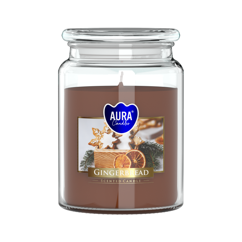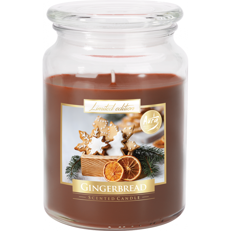 Duża świeca zapachowa w słoiku z wieczkiem, o zapachu pierniczków czasie palenia do 100 godzin BISPOL.