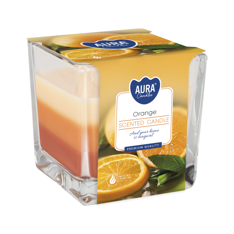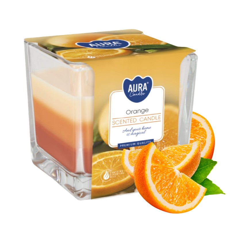 Trójwarstwowa świeca zapachowa w szkle z dwoma knotami, o zapachu pomarańczy oraz czasie palenia do 32 godzin BISPOL.