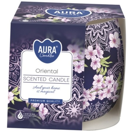 Świeca zapachowa w szkle, ozdobiona folią z motywem orientalnym oraz czasem palenia do 20 godzin BISPOL.