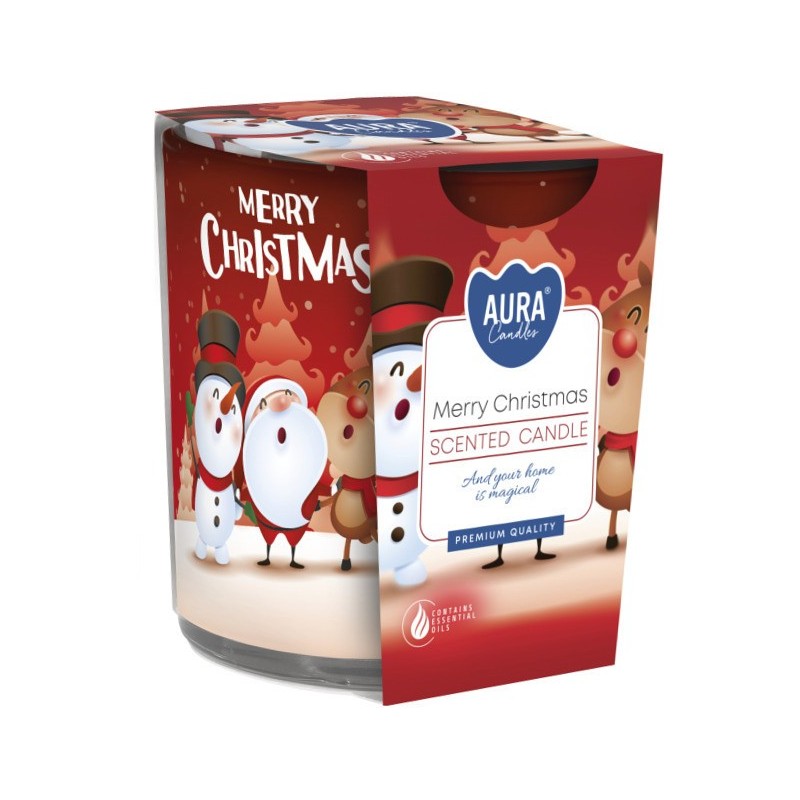 Świeca zapachowa w szkle, ozdobiona folią z motywem wesołych świąt oraz czasem palenia do 22 godzin BISPOL.