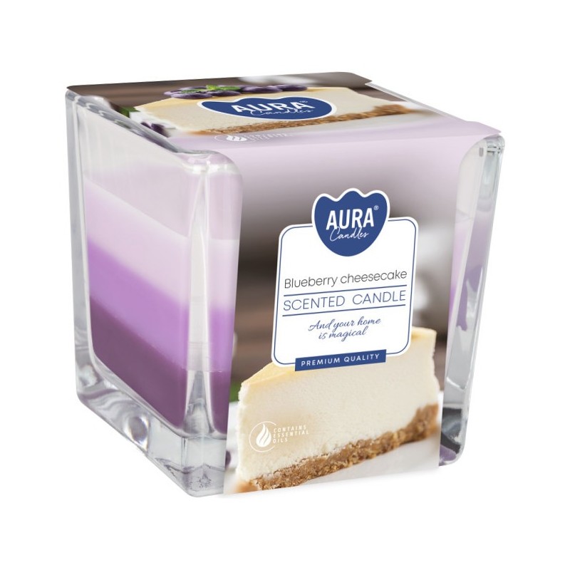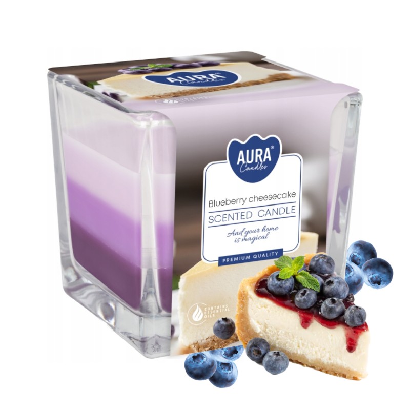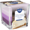 Trójwarstwowa świeca zapachowa w szkle z dwoma knotami, o zapachu sernika jagodowego oraz czasie palenia do 32 godzin BISPOL.