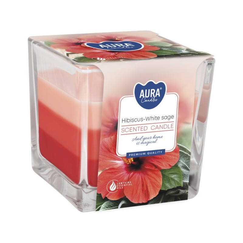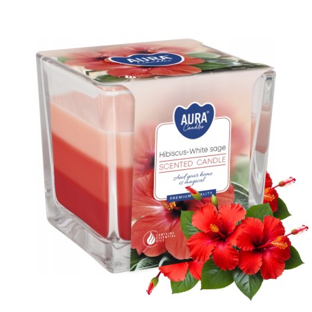 Trójwarstwowa świeca zapachowa w szkle z dwoma knotami, o zapachu hibiskusa i białej szałwii oraz czasie palenia do 32 godzin BISPOL.