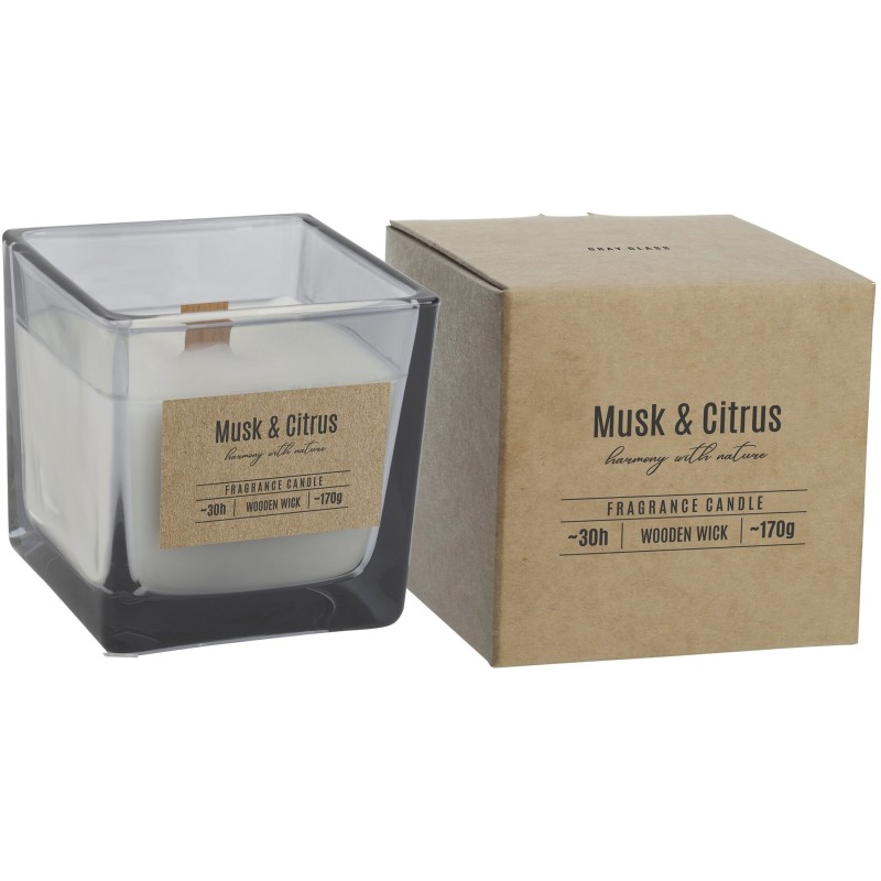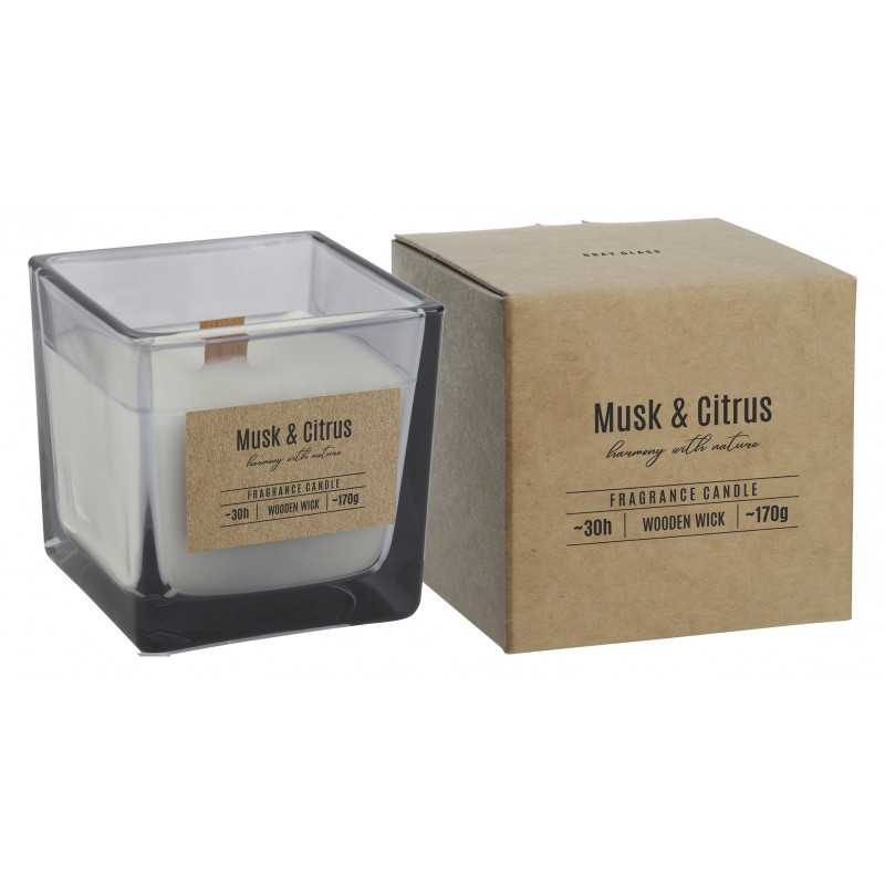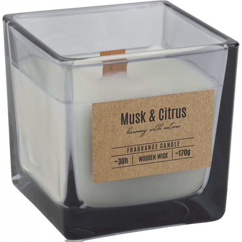 Świeca zapachowa w szkle z drewnianym knotem o zapachu piżma i cytrusów oraz czasem palenia do 30 godzin BISPOL.