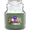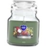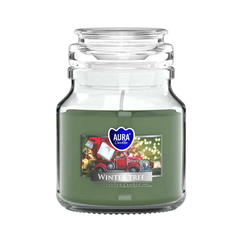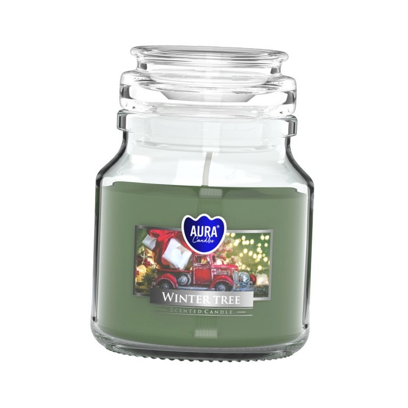 Mała świeca zapachowa w słoiku z wieczkiem, o zapachu zimowego drzewka i czasie palenia do 28 godzin BISPOL.