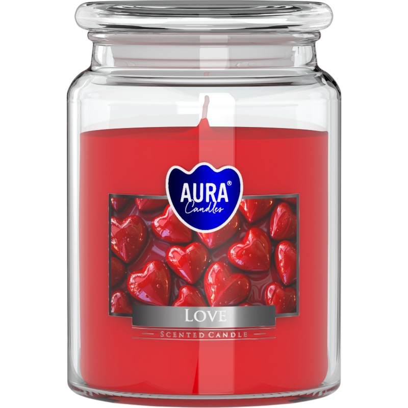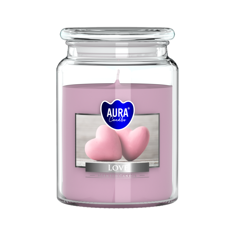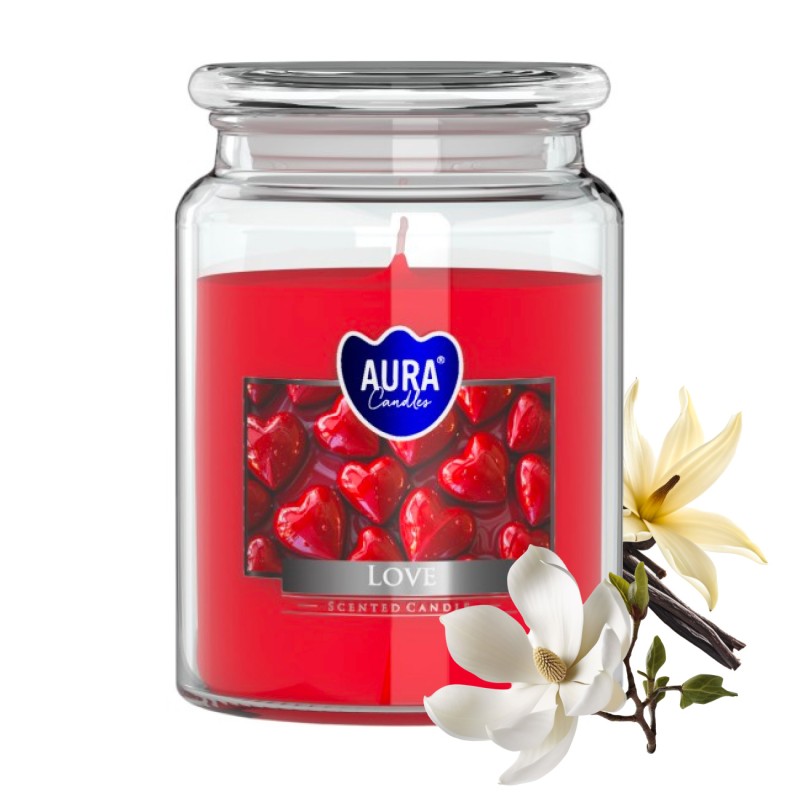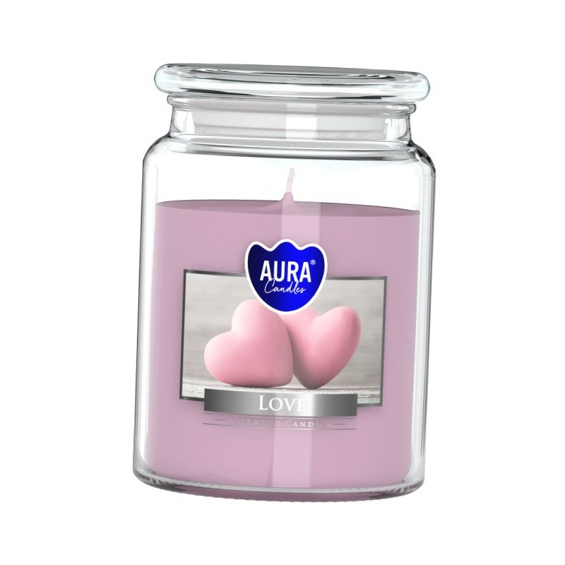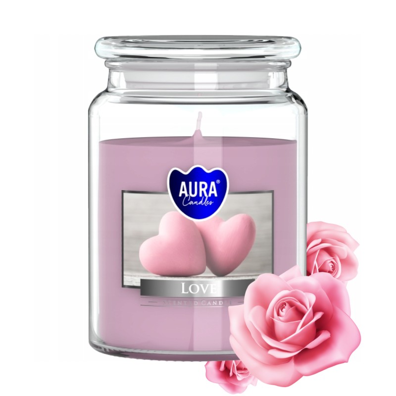 Duża świeca zapachowa w słoiku z wieczkiem, o zapachu love i czasie palenia do 100 godzin BISPOL.
