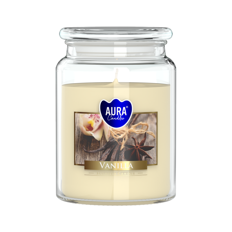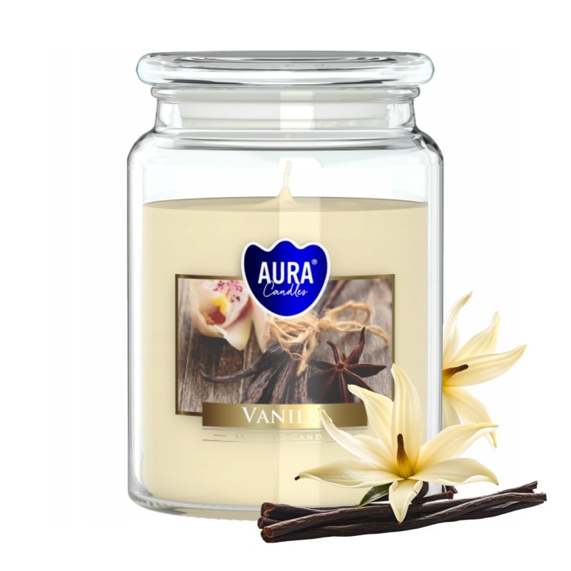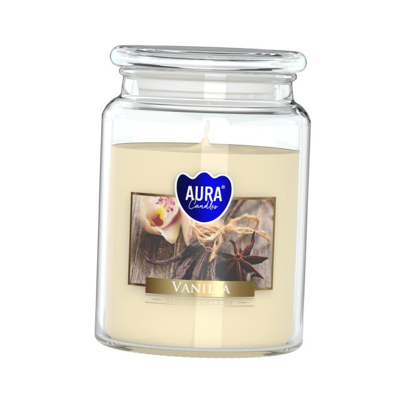 Duża świeca zapachowa w słoiku z wieczkiem, o zapachu wanilii i czasie palenia do 100 godzin BISPOL.